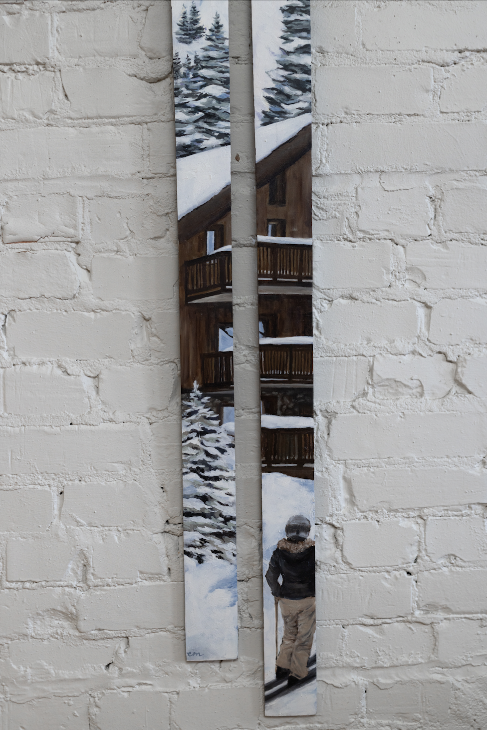 Born in Detroit in 1999, Elena Masi is an oil painter working in Northern Michigan. She began drawing and painting in her early childhood and has developed her artistic voice over the years by intertwining unexpected surfaces with meaningful landscapes. Most known for her painted antique skis, Masi has transformed an offhand idea from a family member into her main creative practice. Preparing the skis for painting is meditative for her; she carefully deconstructs the bindings and primes the surface for fine art. These skis serve as both canvases and historical objects, adding layers of context and storytelling to her work.